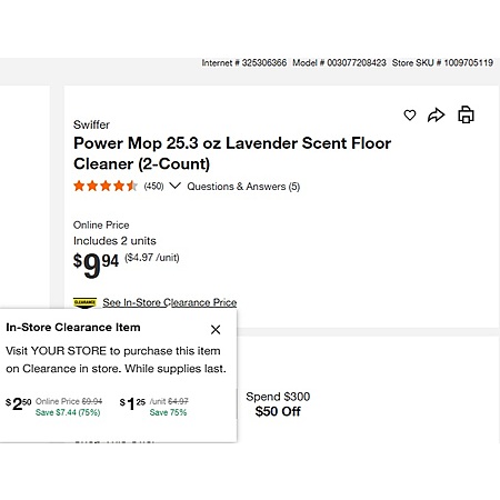 2-Count 25.3-Oz Swiffer Power Mop Refill Solution (Lavender) $2.5 ($1.25 Ea). Pricing/offer is valid for in-store purchase only. Stores that still have stock will have a "See in-store clearance price" link under the $9.94 Online price. YMMV