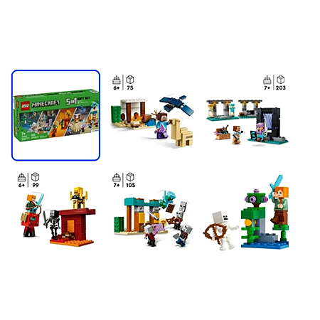 Model: LEGO Minecraft Gift Set - 5 epic sets with 15 characters in 1 Box: Steve’s Desert Expedition, The Armory, The Nether Lava Battle, The Illager Desert Patrol, and The Lush Cave Fight - 66805
