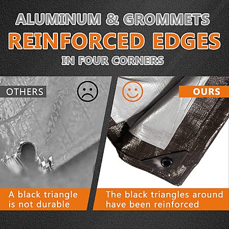 • Grommets & Reinforced Edges: Our waterproof tarp features reinforced edges with sturdy metal grommets every 36 inches, allowing for secure tie-downs and easy installation, to provide additional support, the hem is reinforced with poly rope that is stitched from one end to the other on all sides, ensuring resistance against tearing and deformation.