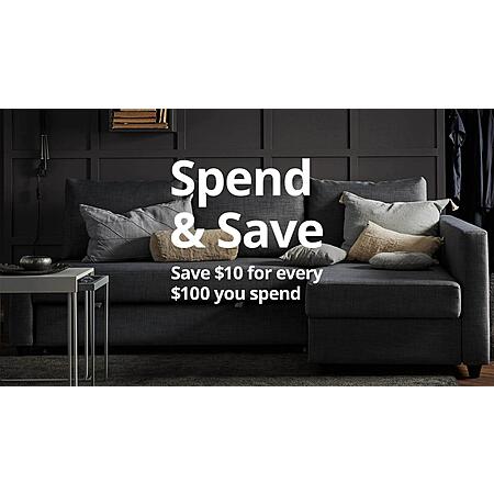 Must provide or sign-in with IKEA Family member or IKEA Business Network customer account in order to receive offer. Not valid on previous purchases. Discount applied in $10 increments for each $100 spent on eligible purchases before tax, shipping and handling. Maximum of $100 in savings.