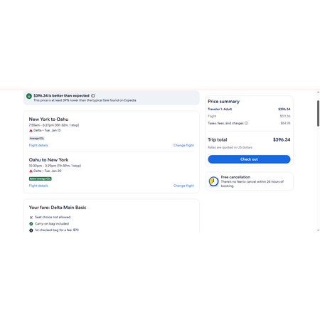 Delta Air LInes and Expedia have round trip airfares travelling to and from New York (JFK) and Oahu Hawaii (HNL) for $397, making 1 stop both ways. These are basic economy fares that allow a personal item and a carry-on bag. There is no seat selection and no change.