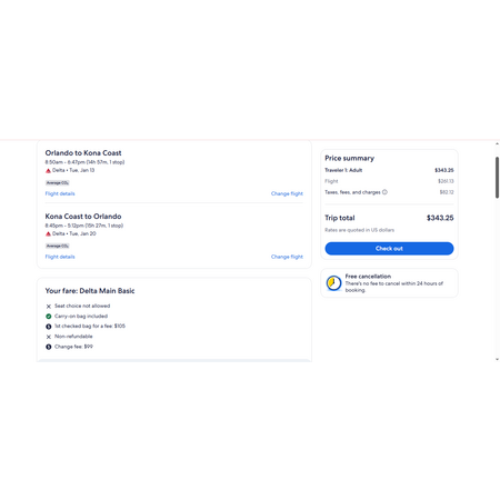 Delta Air LInes and Expedia have round trip airfares travelling to and from Orlando FL (MCO) to Kailua-Kona Hawaii (KOA) for $344, making 1 stop both ways. These are basic economy fares that allow a personal item and a carry-on bag. There is no seat selection and no change.
