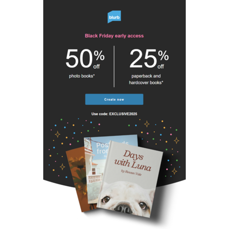 *Save 50% on photo books or save 25% on trade books, notebooks, journals, & magazines with code: EXCLUSIVE2025. Offer valid through November 19, 2025 (11:59 p.m. local time). Valid only for photo books, trade books, notebooks, journals, & magazines uploaded to and purchased through your own account. The discount is applied toward your product total with no minimum or maximum order amount. This offer has a maximum value of $500. This offer is good for one use, and cannot be used for ebook or PDF purchases, and wall art, or combined with volume discounts, custom orders, other promotional codes, gift cards, or used for adjustments on previous orders.