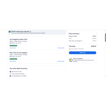 United Airlines and Expedia have round trip airfares travelling to and from Los Angeles (LAX) and New Jersey (EWR) for $179, nonstop. These are basic economy fares that allow a personal item. There is no seat selection, no carry-on bag and no change. If you are travelling with children, you will be seated together as per UA's policy.