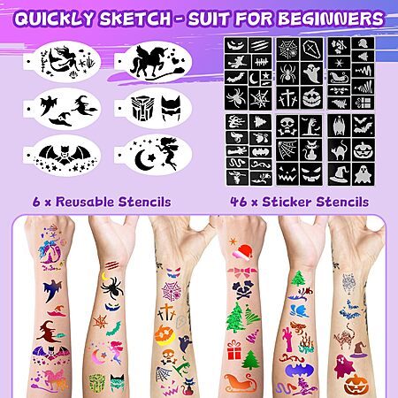 - 【All-Inclusive Face Painting Kit for Kids】This integrated face painting kit includes 42 vibrant colors: 8 fluorescent paints, 16 glitter paints, and 18 classic paints. It also comes with a 50g box of black and white paint, a red-white-blue American flag paint stick, a 8ml spray bottle, 10 brushes, 2 water-drop sponges, 2 finger sponges, 2 gem sticker sheets, 6 reusable stencils, and 6 sticker stencils. An all-inclusive professional face painting kit for endless creative possibilities
