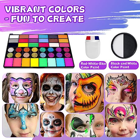 - 【Perfect for All Occasions and Creative Projects】The variety of colors and tools allows the face paint kit for creative freedom, making it ideal for family activities, costume parties, stage performances, or other creative projects. Whether it's Halloween, Easter, Christmas, Day of the Dead, Independence Day, glow in the dark party, birthday parties, school plays, carnivals, cosplay, or other occasions, this kids face paint kit can add fun and joy