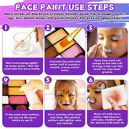 - 【Water Activated and Easy to Remove】This water activated face paint is simple to apply—just add water! Activate the paint with water until it reaches a smooth, creamy consistency. Then use sponges or brushes to start your face painting. It can be easily washed off with warm water/ mild cleanser, making it a professional facepaint makeup kit that ideal for kids and beginners. And for stubborn glitter, just need to dissolve with baby oil first