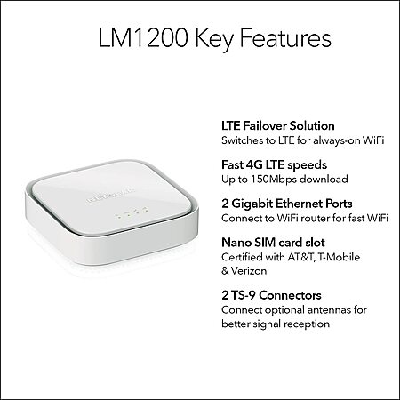 Model: NETGEAR 4G LTE Broadband Modem (LM1200) – Use LTE as a Primary Internet Connection or Failover Solution for Always-On WiFi | Certified with AT&T, T-Mobile & Verizon