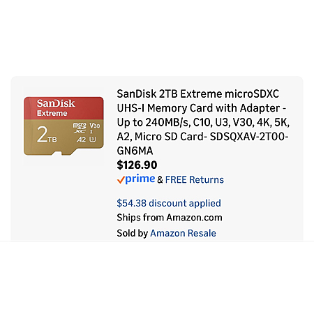 Model: SanDisk 2TB Extreme microSDXC UHS-I Memory Card with Adapter - Up to 240MB/s, C10, U3, V30, 4K, 5K, A2, Micro SD Card- SDSQXAV-2T00-GN6MA