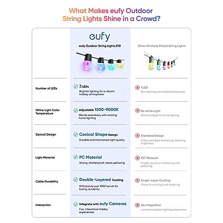 Model: eufy Outdoor String Lights E10, 96ft with 30 Smart RGBWW LED Bulbs, Endless AI Light Themes for Christmas Decorations, IP65 Waterproof for Patio, Fence, Balcony, Link with Cameras, Voice & App Control