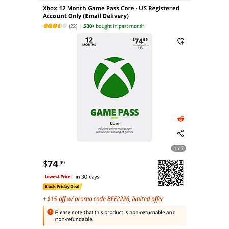 Xbox 12 Month Game Pass Core - US Registered Account Only (Email Delivery) $65.09