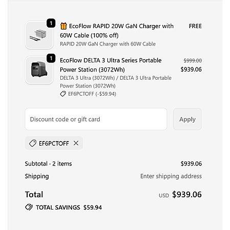 Ecoflow direct has lowered the sale price on Delta 3 Ultra (NEW MODEL) 3kWh Portable power station down to $999 (note early bird price was $1399!) - use code EF6PCTOFF brings it down another 6% to $939.06 ! FREE shipping