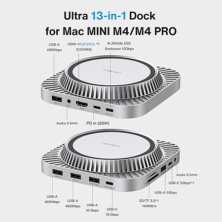 iVANKY 13-in-1 Mac mini m4 Dock with M.2 NVMe SSD Enclosure, 4K@120Hz HDMI, 10 Gbps USB-A/ USB-C $55 + FS