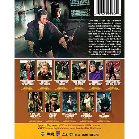 This exciting box set, the next volume in Shout's popular Shaw Brothers Classics line, comprises 11 classic martial arts films from the famous Shaw Brothers library featuring some of their greatest stars and assassins. Get ready for some exciting thrills and chills as heroes meet villains in a duel to the death.