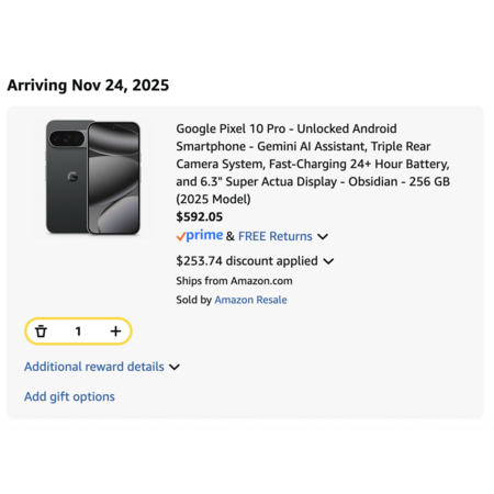 $592.05 Google Pixel 10 Pro - Unlocked - Obsidian - 256 GB (Amazon Resale - Like New)