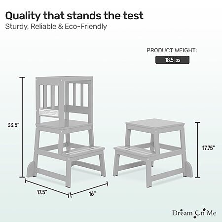 - It's time to elevate learning time literally! Introducing the Dream On Me 2-in-1 Learning tower and step stool a must-have as your toddler grows to achieve new milestones. Take learning on the go, from room to room, with this sturdy piece that's made of solid New Zealand Pinewood. Easy to assemble, it's a multi-purpose stool that can be used in the kitchen to teach your little one simple cooking, in the bathroom as you teach them to brush their teeth, or even outdoors! Safety is the word in our world. This is why the Dream On Me Learning Tower and Step Stool is made of baby-safe, non-toxic paint and comes with an anti-slip top base, anti-skid bottom, and safety rails for additional child safety. What's more, it comes in 4 finishes to seamlessly fit into your home's aesthetic - White, Natural, Black, and Cool Grey. This product is meant for children aged 18 months to 3 years.