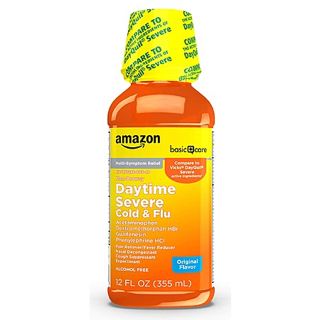 Amazon Basic Care Severe Daytime Cold and Flu, Maximum Strength Liquid Cold Medicine, Non-Drowsy, Multi-Symptom Relief, for Adults and Children Age 6 and Over, Original, 12 fl oz (Pack of 1)