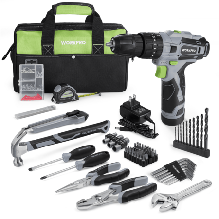 | Product Description: | For 25 years, WORKPRO has adhered to its simple core value -- to support and encourage the "Can Do" attitude of its customers with high-quality, affordable tools that are among the most dependable performance tools on the market. WORKPRO is part of the family of companies of Hangzhou GreatStar Industrial Co., Ltd., a leading global developer, manufacturer, and supplier of tools found in over 100 countries throughout the world. - 3-in-1 Tool lets you choose among drive, drill, or hammer drill making it more versatile. The 18-torque setting is specifically designed to prevent screws from stripping and keep the motor from being overworked or burnt up. The drill also features two variable speed switch: 0-400RPM and 0-1500rpm. Maximum size of Keyless Chuck: 3/8” - With a 2000mAh lithium-ion battery and efficient charging capabilities, it provides sufficient power and runtime for typical DIY tasks, ensuring you can work efficiently without interruption. - It contains tools needed for most small repairs and basic DIY projects around the house. Forged needle nose pliers, slip joint pliers and a claw hammer are made of high-quality durable steel. 2pc magnetic CRV screwdrivers (PH2×4"& 3/16"×12") can also help you complete the work. 8PCs CRV Allen keys range from 1/16"to 1/4”. There is also a 10ft tape measure and a retractable box cutter which comes with 10pc extra sk5 blades. - Made from 600D polyester fabric, which provides unmatched durability and reliability. The tool bag features an open wide mouth with an internal metal frame and top double-pull zipper for easy organization and access. It boasts 6 sturdy internal pockets, 4 external pockets (one is super big) as well as a large interior space that affords you retrieval of any tools. Size: 14 * 9 * 6-1/2 Inch. - Electric power drill set: ☄Cordless Drill/Driver, ☄12V Lithium-Ion Battery, ☄Charger, ☄HSS Drilling Bits. Bag & Hand tool set: ☄Storage Bag, ☄Tape Measure, ☄Adjustable Wrench, ☄Needle Nose Pliers, ☄Slip Joint Pliers, ☄Magnetic Phillips/Slotted Screwdrivers, ☄Box Cutter and Blades, ☄Claw Hammer, ☄Allen Wrench Set, ☄Screwdriver Bits & Magnetic Bit Holder, ☄Sockets, ☄ Screw Assortment Kit. |