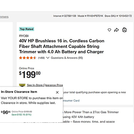 Select Home Depot Stores have RYOBI 40V HP Brushless 16" String Trimmer w/4Ah Battery/Charger $97 YMMV. Pricing/offer is valid for in-store purchase only. Stores that still have stock will have a "See in-store clearance price" link under the $199 Online price. YMMV