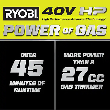 The RYOBI 40V HP Brushless 16" Attachment Capable String Trimmer Kit delivers more power than a 27cc gas trimmer, making it a true gas replacement. 40V HP technology combines a powerful brushless motor, advanced electronics, and high performance lithium technology to provide more power, runtime, and durability with over 45 mins. of runtime using a 40V 4Ah battery. Save money, time, & space with attachment capability & transform your string trimmer into a variety of tools. This trimmer is compatible with RYOBI EXPAND-IT attachments & other universal attachments to take on any job around the yard. Tackle thick weeds & grass with the adjustable 14"-16" cut swath. Easily optimize for runtime or performance with the tool free integrated sliding guard, allowing you to quickly adjust your cut swath. This trimmer also has a durable carbon fiber shaft for a lighter weight trimming experience. Achieve max. control with the variable speed trigger & quickly change the speed with the 2 speed switch for optimal power/runtime. Conveniently reload your .095" line in under 60 seconds with the REEL EASY+ 3-in-1 bump-feed head. Your 40V 4Ah battery recharges in less than 60 minutes with the included 40V Fast Charger. Best of all, it is part of the RYOBI 40V system where any 40V battery works with any 40V product. This 40V HP Brushless 16" Attachment Capable String Trimmer Kit is backed by the RYOBI 5-Year Manufacturer's Tool Warranty, 3-Year Manufacturer's Battery Warranty.