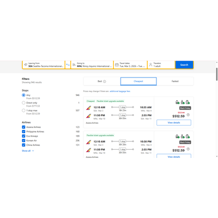 Asiana Airlines via Booking.com have round trip airfares travelling from Seattle (SEA) to Manila Philippines (MNL) for $513, making 1 stop Seoul Korea for varying number of hours both ways. Stopover duration depends on the flight you choose. These are economy fares that allow a personal item, a carry-on bag and 1 free checked bag.