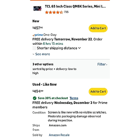 Used - Like New: TCL 65 Inch Class QM6K Series | Mini LED QLED 4K HDR | 65QM6K | 120HZ-144HZ | 2025 Google TV
