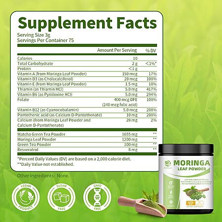 - Powerful Multi-Ingredient Formula: This supplement features a thoughtfully crafted blend of nutrient-dense superfoods including Moringa Leaf Powder, Matcha Green Tea Powder, Green Tea Powder, and Resveratrol. Together with a range of essential vitamins like B12, D3, B6, and folate, this comprehensive formula is designed to nourish your body from the inside out, supporting energy, immunity, and overall well-being.