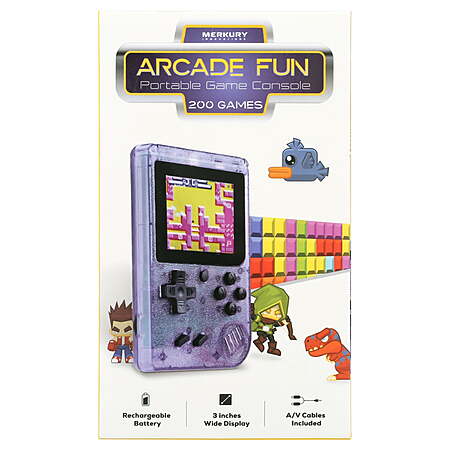 | Product Description: | Discover endless fun with the Merkury Innovations Arcade Fun Portable Game Console for Child or Adult. Designed for both adults and children, this console comes in a vibrant purple color. It features 200 preloaded games, including arcade, puzzles, shooting, racing, fighting, and adventure games. The 3-inch backlit LCD screen offers clear visuals, while the slim and portable design makes it easy to carry anywhere. With a rechargeable 3.7V lithium-ion battery, you get up to 6 hours of continuous gameplay. The console also includes AV cables, allowing you to connect to your TV for a larger gaming experience. Perfect for travel, camping, commuting, or relaxing at home. Merkury Innovations Portable Handheld Video Game Console with 200 Classic Games 200 Preloaded Games: Enjoy a variety of classic games including arcade, puzzles, shooting, racing, fighting, adventure, and more 3Inch Backlit LCD Screen: Provides clear and vibrant visuals for an immersive gaming experience Portable and Slim Design: Compact and lightweight, perfect for gaming on the go Rechargeable Battery: Equipped with a 37V lithiumion battery that lasts up to 6 hours of continuous gameplay AV Cables Included: Easily connect to your television for a bigger, better gaming experience |