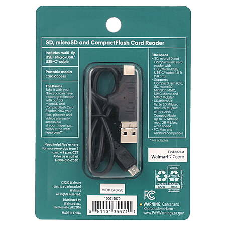$5*:onn Compactflash(CF)|SD|microSD|MiniSD Plug N Play USB/Micro-USB/USB-C Memory Card Reader