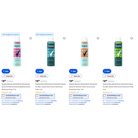 $8.97 + $3 Walmart Cash (limit 2) - Degree Whole Body Deodorant Spray (Various Scents - Men/Women)