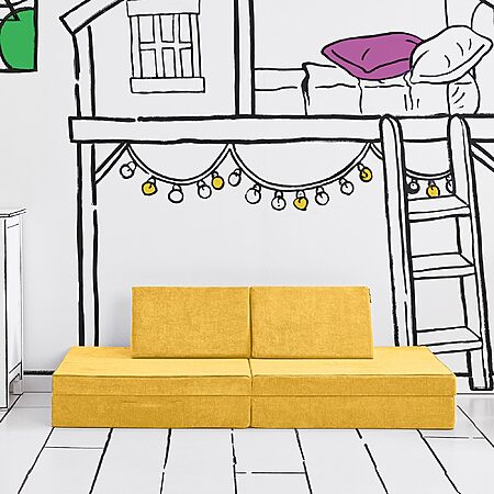Endless Possibilities: The YOURIGAMI Sunflower Yellow Kids Play Couch comes with 4 modular pieces that can be transformed into countless imaginative shapes for rest or play; Hinged panel covers also include handles for easy moving and a stash pocket; Pair with the YOURIGAMI Play Castle for bigger deluxe configurations and even grander adventures