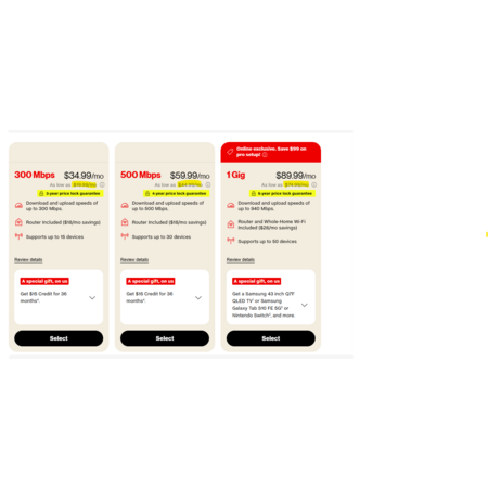 FIOS $19.99 300 Mbps for 3 years; FIOS $74.99 1 Gig for 5 years New / Returning Customers
