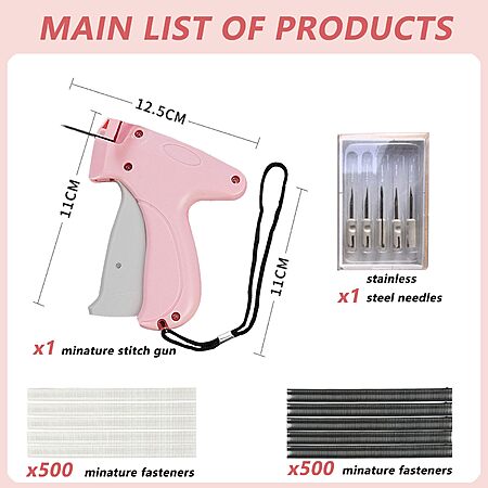 - Stitch Gun Kit: This Stitch Gun set includes 1 micro tagging gun, 6 fine needles, 1000pcs fasteners (500 white and 500 black) . This Quick Clothing Fixer is an essential tool, from creating temporary hems and repairing clothes in emergencies to seamlessly altering clothes in any occasion. Ideal for those who looking for an easy-to-use tag gun for home and shop businees needs.Ditch the traditional sewing kit.