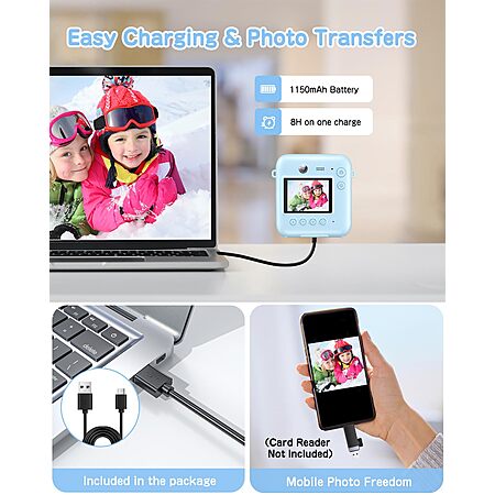• Ease of Use & Long Battery Life - Our instant toddler camera is designed for ease of use, combining simplicity with functionality. The intuitive button layout allows young photographers to get started quickly. Charging is effortless, and a single charge provides up to 8 hours of uninterrupted fun, perfect for outings and playtime. We also include a 32GB micro SD card, capable of holding over 2,500 colorful electronic photos. When it's time to share memories, the included Type-C cable makes it easy to connect the instant camera to a computer for quick photo downloads
