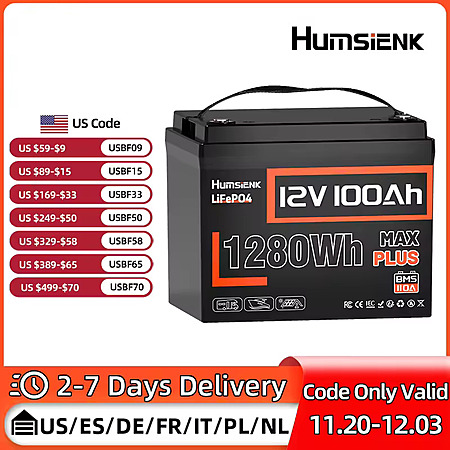Humsienk Direct Store via AliExpress [aliexpress.us] has Humsienk LiFePO4 Lithium Battery 12V 100AH BMS 100A 1280Wh on sale for $96.XX - $14 extra off w/ promo code RE14 = $82.XX. Shipping is free.