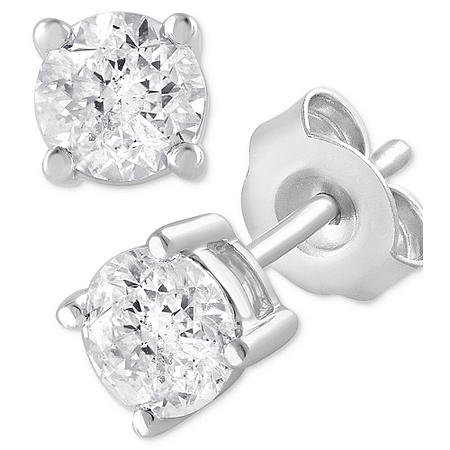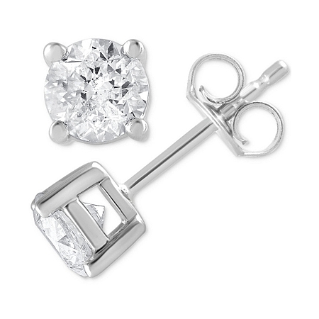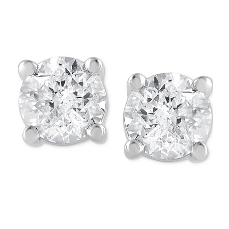 1 Carat Lab Grown Diamond Earrings• Diamond Color Rating Code: J• Diamond Clarity Rating Code: I1-I2• Diamond Shape: Round• Set in sterling silver• Approx. diameter: 1/5"• Post back closure• PLEASE NOTE: A pair of 1 carat total weight stud earrings = approximately 1/2 carats each stud.
