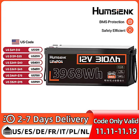 Humsienk 12V 310Ah LiFePO4 Battery 3968Wh Energy 100A BMS A+ Cells $227 + Free Shipping