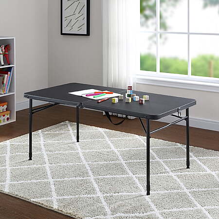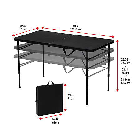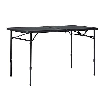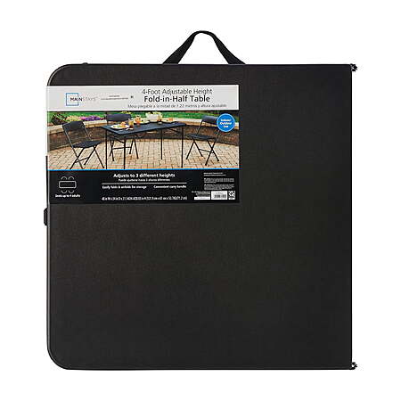 | Product Description: | Provide all of the table spaces that you need in all kinds of settings with the Mainstays 4' Fold-in-Half Adjustable Table in Rich Black. This versatile rectangular table is sturdy and durable, made with reliable materials, and folds for easy storage and transportation. When you're finished using it, just fold in the metal legs, fold the table in half, and your new compact table is ready for transport! Its classic black color is sure to fit in at any gathering in any setting, and its spacious expanded 48" long table-top is ideal for holding a wide variety of foods, crafts, or whatever items you are working with! It's great for everyday use both indoor and outdoor, as a serving table, craft supply table, outdoor meal table, or for whatever purposes you may need. The plastic tabletop is easy to clean with no fuss just wipe it down with a damp cloth, and it will look as good as new! The carrying handle makes it perfect for taking on the go, for outdoor barbecues, game nights, school activities, parties, or tailgating events. The table comfortably seats 4 adults, so all of your friends and family can be included. Mainstays 4 Foot Fold-in-Half Adjustable Indoor Outdoor Table, Rich Black Product Dimension:48" W x 24" D x 21.14" - 24.4" - 28.03" H Comfortably seats 4 adults Easily folds in half for convenient storage Classic black color coordinates with almost any decor! Includes a built-in carry handle, for easy transportation Rubber stoppers on the legs for added grip on floor surfaces Appropriate for use indoors or outdoors Easy-to-clean resin surface Strong durable powder-coated metal construction Number Of Pieces: 1 x folding table |
