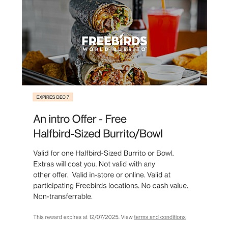 For existing customers and new account sign ups. Requires a credit card, email, phone number associated with the account. Reward lasts 2 weeks after you unlock it. Offer may be for a limited time since Freebirds is under new ownership (and more expensive)