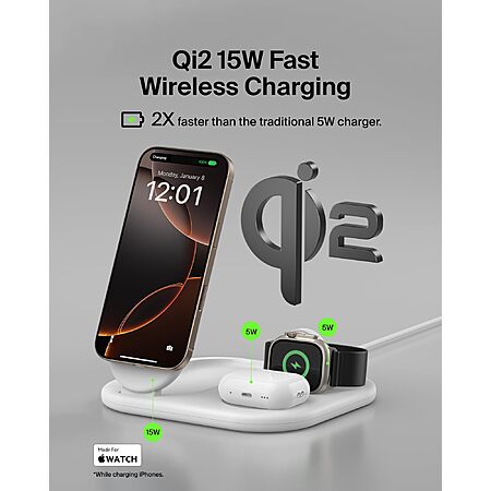 Model: Belkin - 3-in-1 15W, Foldable Magnetic Qi2 Charging Station for iPhone 16, Apple Watch, AirPods, and More, w/Non-Slip Base & PSU - White