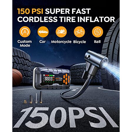 ➤【 150PSI CORDLESS FAST INFLATION, 8X Faster】Only 3 steps to go-- smart preset, fast inflate and auto shut-off. With powerful turbo 45L/Min airflow, portable car jump starter with air compressor inflates a car tire to 30 PSI in just 2 minutes. 5 inflation modes ( custom mode up to 150 PSI), 3 inflation units, a detachable extended air hose and 4 air nozzles for inflating all cars, motorcycles, bikes, balls, etc. 3.3-inch large screen, visible in sunlight, ±1 PSI precision - no overinflating. Memory function for easy one-key inflation next time. Please let the pump cool for at least 10 minutes after every 15 minutes of use.