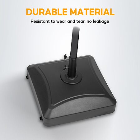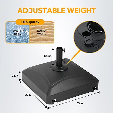 - Heavy & steady: A heavy weighted base keeps your umbrella firmly in place-resisting the wind while supporting your shade, weight with sand: 125lbs/ weight with water: 88lbs. (Note: Water and sand are NOT included)