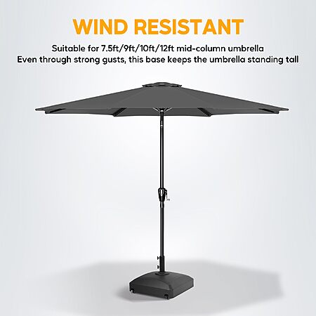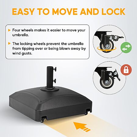 - Easy to move: Come with 4 wheels, this umbrella base can be moved easily while a set of 2 wheel locks keep stability.