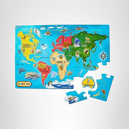 - EASY-TO-ASSEMBLE FLOOR PUZZLE: The Melissa & Doug World Map Jumbo Jigsaw Floor Puzzle is a 33-piece, easy-to-assemble floor puzzle that measures 2' x 3' when assembled.