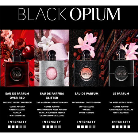 Black Opium Glitter, a long-lasting, sweet, and sensual interpretation of Black Opium propels the gourmand perfume further into the yummy universe. The iconic coffee-floral Black Opium Eau de Parfum takes a fluffy, sweet, and sexy turn with a sought-after marshmallow musk accord.