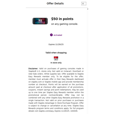 Staples Easy Rewards has $50 back in Staples points with any gaming console (Nintendo Switch 2, PS5, XBox) $399.99