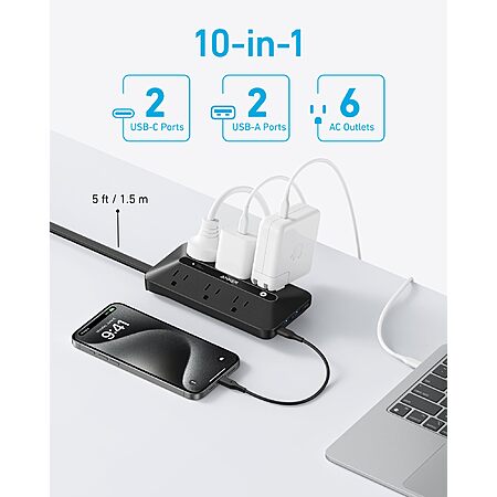 5' 10-in-1 Anker Flat Plug Power Strip w/ 6 AC Outlets, 2 USB-A & 2 USB-C Ports (Black) $19.99 + Free Shipping w/ Prime or on $35+