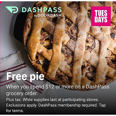 T-Mobile DashPass: Coming Nov 25- Free Pie with DashPass when you spend $12 or more on a DashPass grocery order. Limited time. Redeem 1 year free DashPass in T-Life within 30 days of activating an Experience plan.