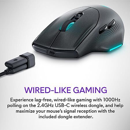 Model: Alienware Wireless Gaming Mouse AW620M - Wireless/Wired, 1 x USB - 4 pin USB Type A, 26000 dpi, 3.52oz (99g) Weight, 7 Buttons, Non-Slip Grip, up to 140 Hours of Gaming - Dark Side of The Moon