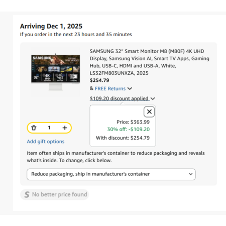 SAMSUNG 32” Smart Monitor M8 (M80F) (SAVE WITH USED - LIKE NEW) $274.54